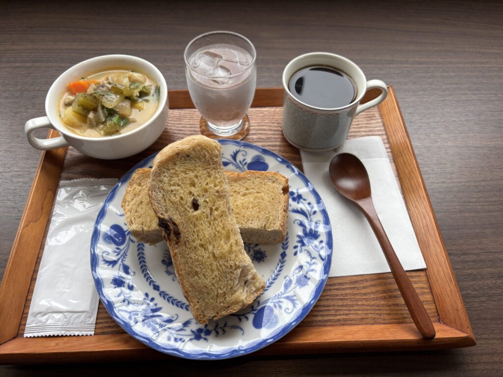 開店時間同時に入ったので、まだ寒めの店内。モーニング(正式メニュー名は下参照)のスープが日替わりのようで、この日は「辛めのトムヤンクン(だったか)です」ということ。パンも、スープもそしてコーヒーもおいしくいただきました。